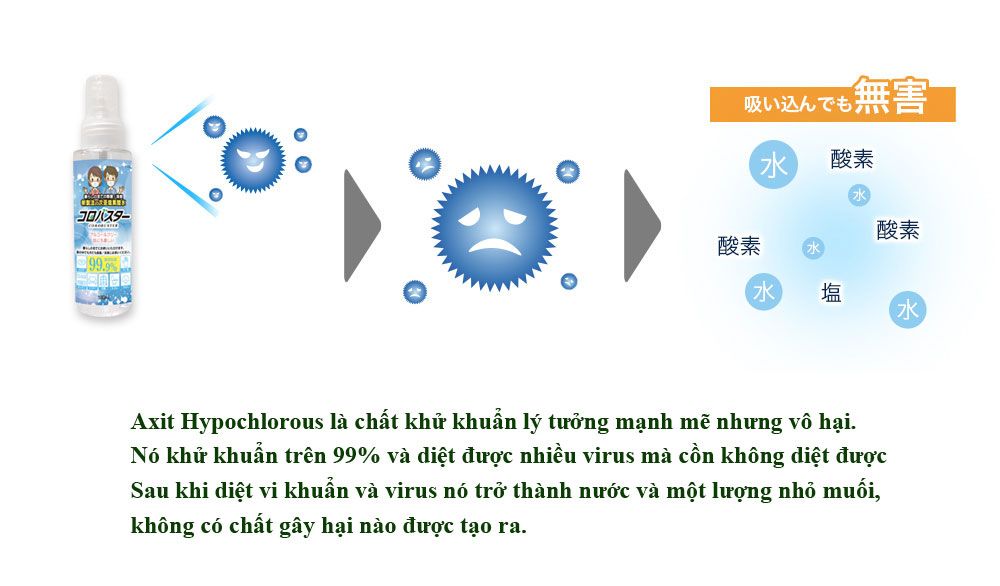 Axit hypochlorous cũng được Bộ Y tế, Lao động và Phúc lợi, Bộ Kinh tế, Thương mại và Công nghiệp, trang đặc biệt của cơ quan các vấn đề về Người tiêu dùng giới thiệu là một trong các phương pháp khử trùng coronavirus mới.